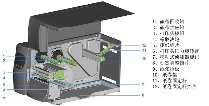 三、碳带回收轴/碳带供应轴/打印头模组/橡胶滚轮/撕纸钢片/打印头压力旋转臂/移动式侦测器旋钮/标签调整挡片/纸张压板/纸卷架/纸卷固定杆/纸卷固定杆挡片